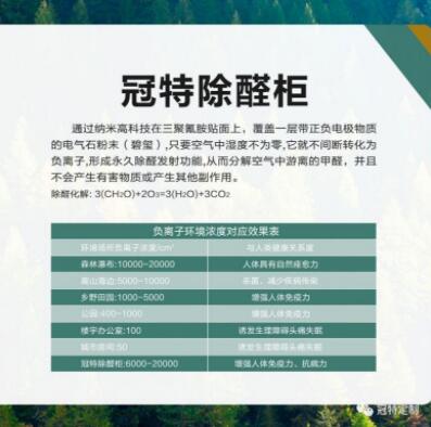 冠特除醛板是通過納米高科技在三聚氰胺貼面上覆蓋一層帶正負(fù)電極物質(zhì)的第四代板,只要空氣中濕度不為零,它就不間斷轉(zhuǎn)化為除醛物質(zhì),形成永久除醛發(fā)射功能,從而分解空氣中游離的甲醛,并且不會(huì)產(chǎn)生有害物質(zhì)或產(chǎn)生其他副作用。經(jīng)過六年的不間斷測(cè)試,由冠特除醛板材制作而成的除醛柜,是絕對(duì)的空間環(huán)保新科技,相當(dāng)于一個(gè)房間有一棵10年以上的樹木!不僅能夠做到自身產(chǎn)品環(huán)保,還可以凈化空氣、吸附有害氣體。